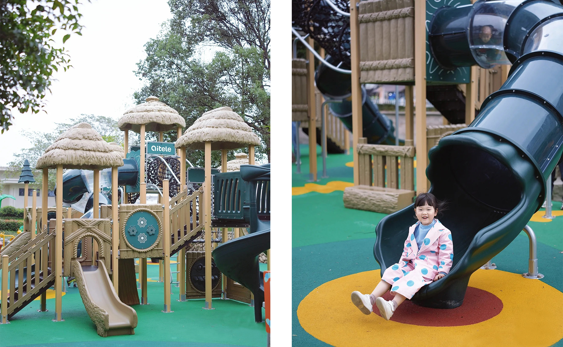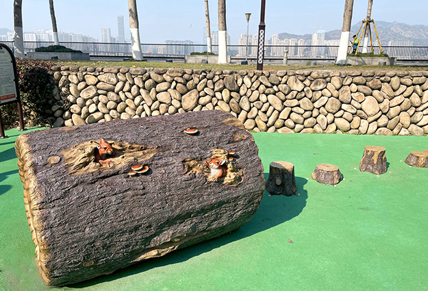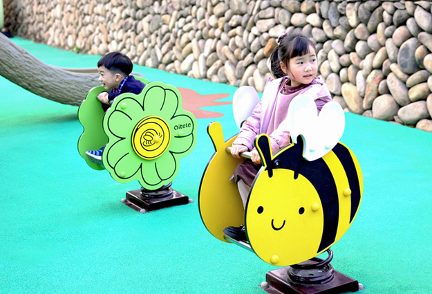 园内设置了多种儿童游乐设施,有自然景观系列滑梯、益智游戏板、传声筒、网笼钻爬、树桩树桶组合、花朵、蜜蜂摇乐等游乐设备。